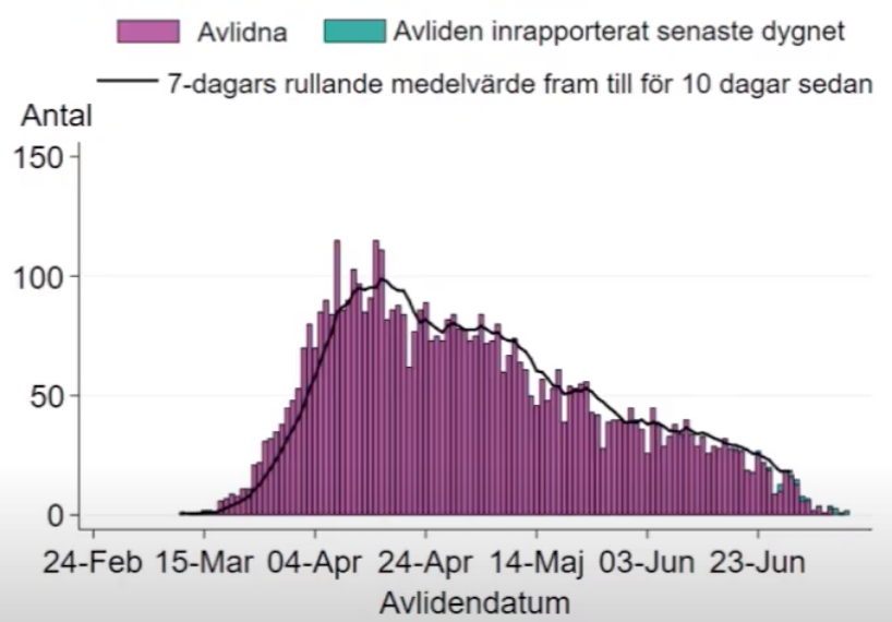 Sweden update 9 July. Daily deaths are declining sharply: only 17 total during the past week. In this slide from today's news conference of the health ministry, 18 deaths are reported (marked in green); several are a week or more ago. pic.twitter.com/idyHW55qcu