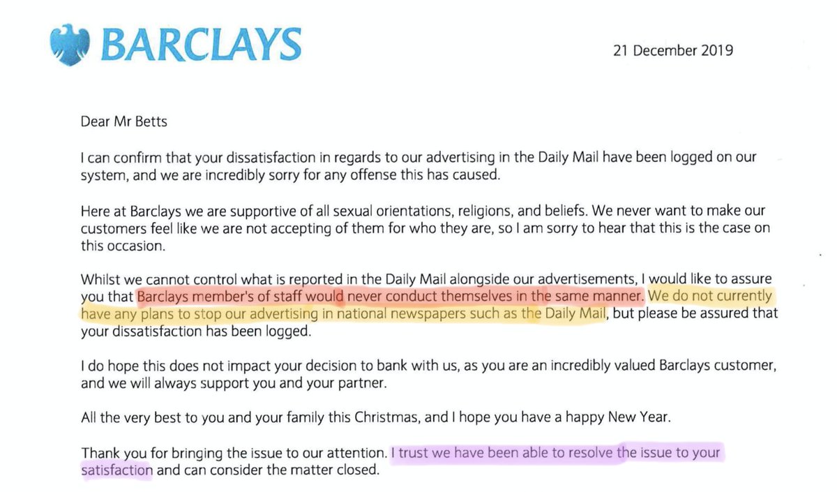 @Barclays to stop advertising in the Daily Mail and they send me this, which I'll paraphrase: 1. We agree that the Mail is bigoted (red) 2. We are going to continue supporting them (yellow) 3. We hope this resolves the issue for you (purple)pic.twitter.com/TSADkhtzdZ