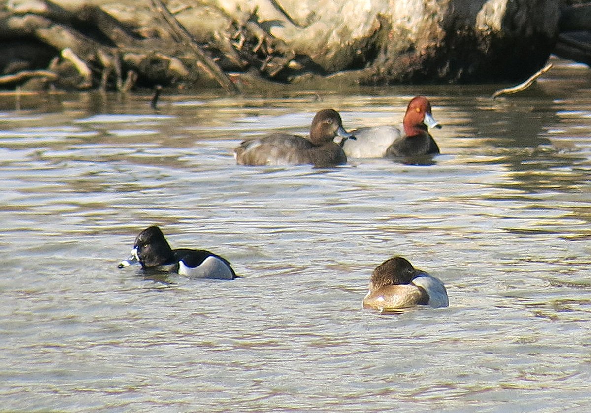 Look at this "Tableau of Ducks" 4 ducks, 3 species, 2 sexes, 2 consciousness states. Ring-necked Duck (male) Canvasback (sleeping female) Readhead (Female and Male) Gunner's Lake, Germantown, MD 02 02 2020pic.twitter.com/WLamhJPPFj