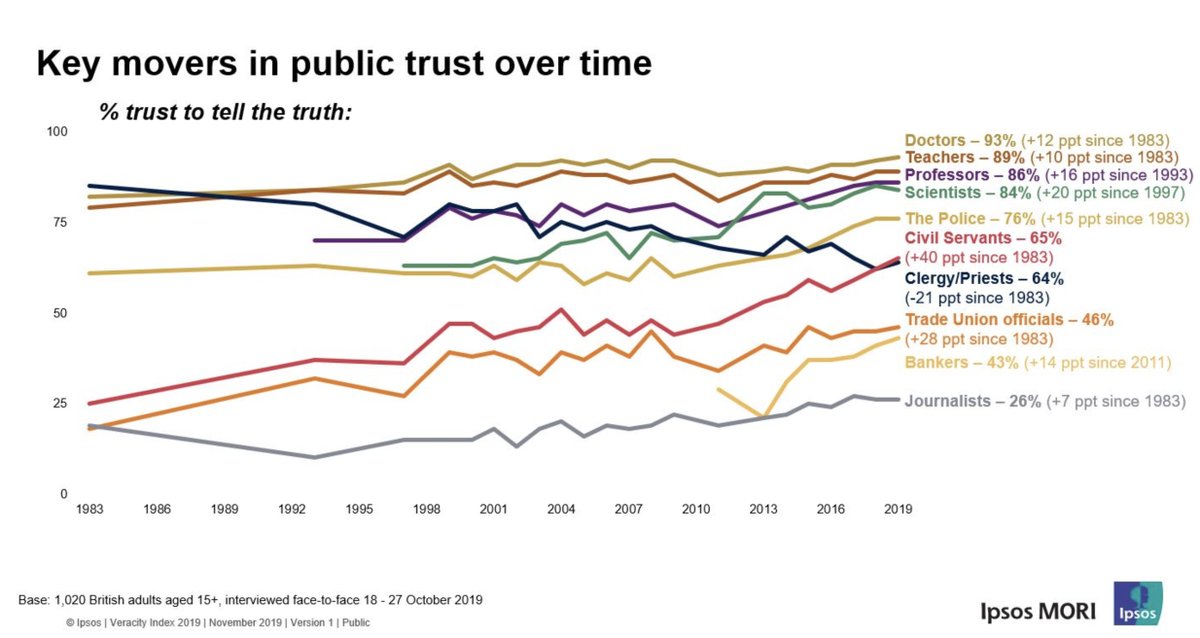 Trust in experts has increased quite substantially over the last years. • 84% of the British population trust scientists to tell the truth. This is up from 64% back in 1997. • All others listed here (except priests) are also trusted more than in the past.pic.twitter.com/RLmvue8mfS
