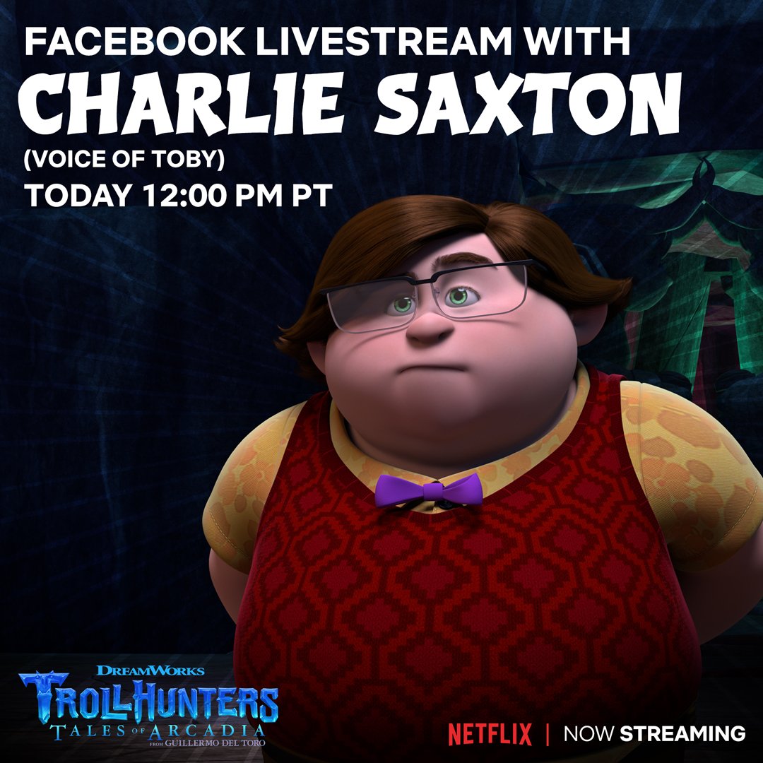@CharlieSaxton (voice of Toby), will be joining us on a Facebook Livestream to talk about the all new season of#Trollhunters! Now streaming on@Netflix!pic.twitter.com/BLI2X1AzDR