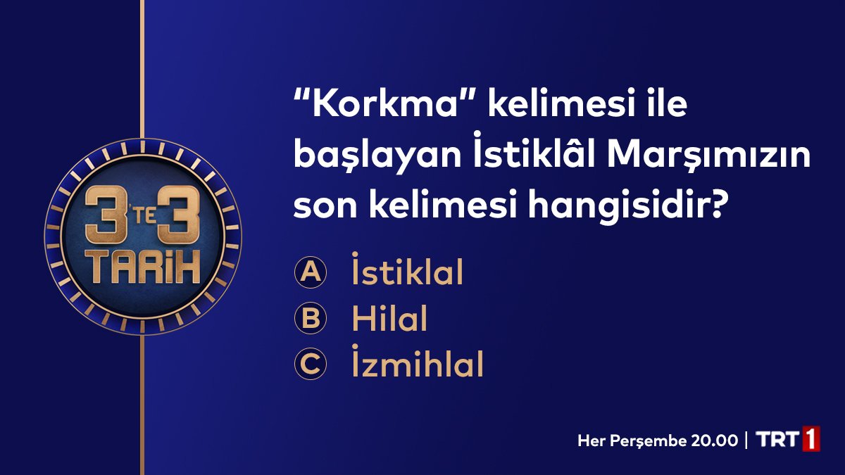“#3te3Tarih” etiketini kullanarak doğru cevabı bizimle paylaş, yarışmamızın son eleme turuna doğrudan katılacak üç kişiden biri olma şansını yakala. 3’te 3 Tarih yeni sezonuyla bu akşam 20.00’de başlıyor!#TRT1pic.twitter.com/gPYOy2Ifng