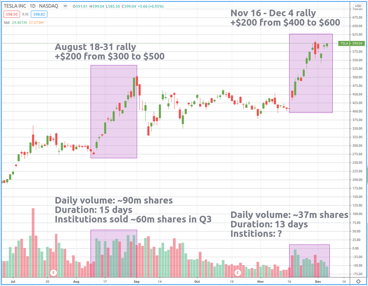 4/ I think it's a reasonable inference & coarse approximation of the trading flows that in August+September TSLA was moved up +$200 and then corrected by -$100, against a net institutional selling of 30m shares in the up leg & 30m shares selling during the consolidation.