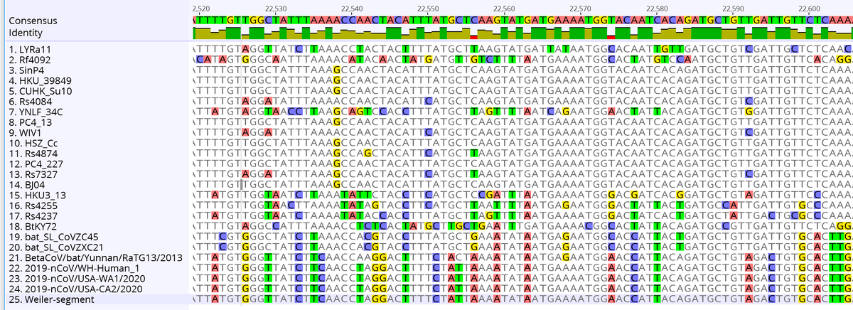 To be clear, these observed insertions in spike protein are completely consistent with naturally occurring evolution in these viruses in bats. Spike has lots of evolutionary pressure and it mutates single bases as well as gains and loses sections across related bat viruses. 1/2