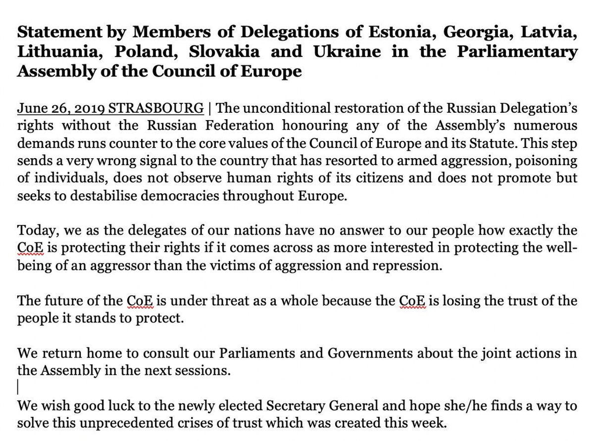 #PACE decision to allow Russia’s return. Morally dubious & goes against@coe principles. We’ll continue to be firm voice against