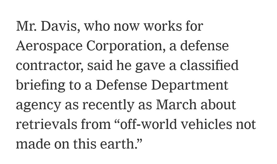 Off-world vehicles... 'Mr. Davis, who now works for Aerospace Corporation, a defense contractor, said he gave a classified briefing to a Defense Department agency as recently as March about retrievals from “off-world vehicles not made on this earth.”'https://www.nytimes.com/2020/07/23/us/politics/pentagon-ufo-harry-reid-navy.html …