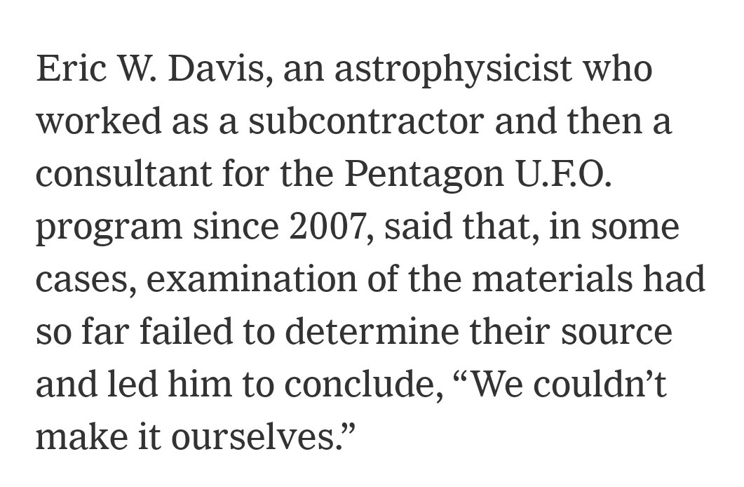 Here is astrophycisist Dr. Eric W. Davis' quote in the NYT article published on July 23, 2020 "...off-world vehicles not made on this Earth." alongside with "We couldn't make it ourselves." Quite exciting stuff!pic.twitter.com/Ia9pONleIq
