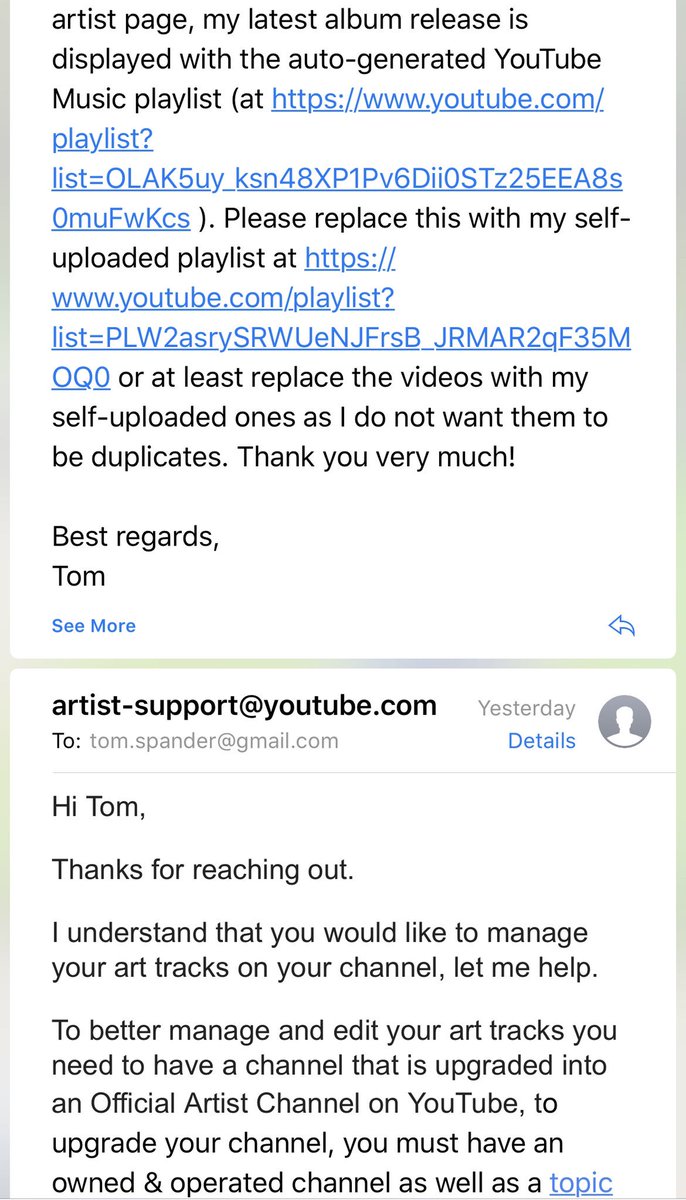 @TeamYouTube @youtubemusic @YTCreators do your support people even look at what they're replying to before copy pasting? Super unhelpful answer as I am already an official artist channel!pic.twitter.com/l1Ic8lh0XL