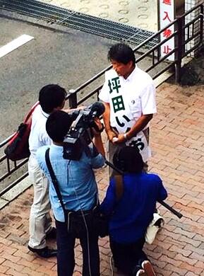 大津市堅田、TV取材を受けながら街頭から訴え(^_^) ぜひ、午後3時からのパルコ前街頭演説会にお越し下さい。