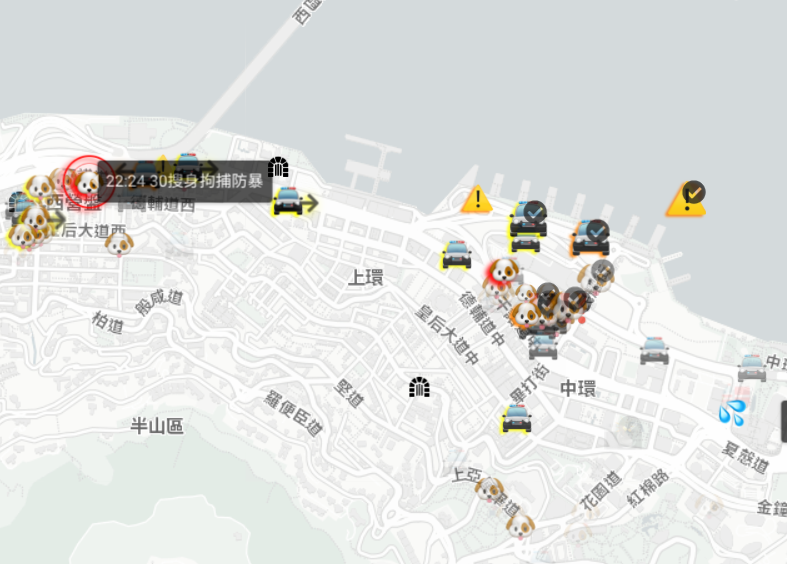 @hkmaplive tonight, the app Tim Cook had pulled from the app store. Demonstrators are trying to get home from a legal protest while police (puppy icons) make violent and abritary arrests. The goal is to try to get to the ferry piers visible on the right safely.pic.twitter.com/iPwIq730uL