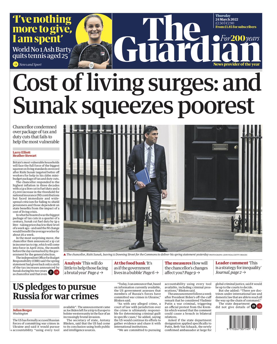 Guardian front page, Thursday March 2022: Cost of living surges: and Sunak squeezes poorestpic.twitter.com/5rzBzIOeg3