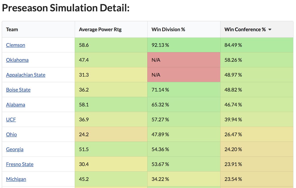 Let's take a spin around the country and go conference by conference using updated simulation detail, with the simulations powered as always by SP+, FPI, Massey and Dokter Entropy.