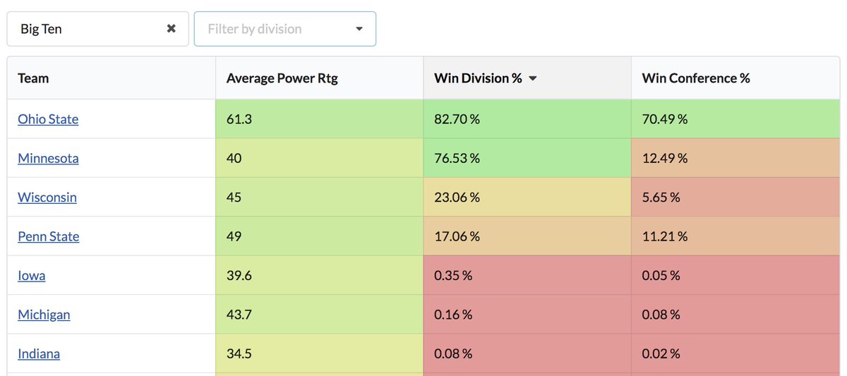 Featuring: A new Big 10 West division favorite, by the slimmest of margins - @GopherFootball Update power ratings, game by game win probabilities and simulation detail, incl. division-level detail not found anywhere else: https://www.simulations.run/ pic.twitter.com/JJlvK3XjwW