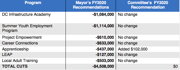 In the FY20 budget, @tweetelissa’s Labor Committee took an unconventional approach to hold programs accountable for their performance & re-focus on providing data to show results. First, they made almost no changes to @MayorBowser's budget recommendations for workforce programs. pic.twitter.com/6TMVMH1uDU