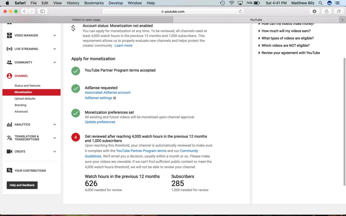 Thanks for reaching out. Could you share a screenshot of your channel monetization page: https://yt.be/help/acmo ? Keep us posted.