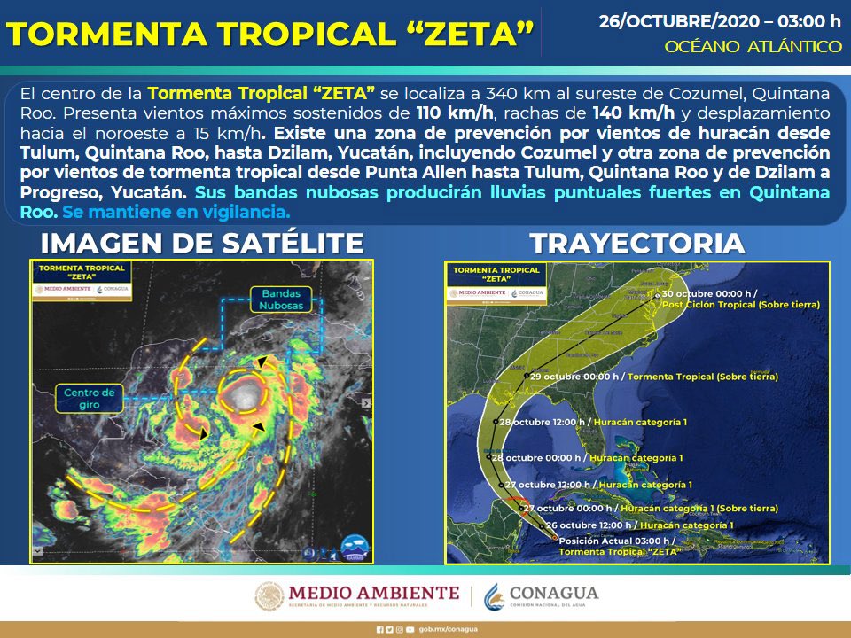 El centro de la Tormenta Tropical #Zeta se localiza a 340 km al sureste de Cozumel,#QuintanaRoo. Contempla vientos de 110 km/h y rachas de 140 km/h. Mantenemos vigilancia permanente. Más información en el gráfico
