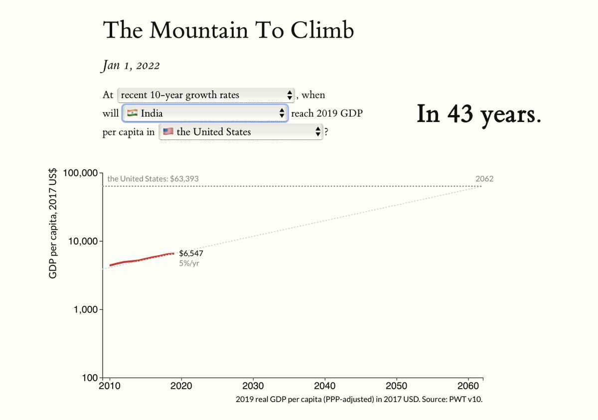 Such a cool and insightful tool! At the growth rates experienced in the last 10 years (about 5%/year), India will take 43 years to get to the US's current (2019) GDP per capita level! https://twitter.com/oliverwkim/status/1478798109236862977 …pic.twitter.com/BRb1txVtih