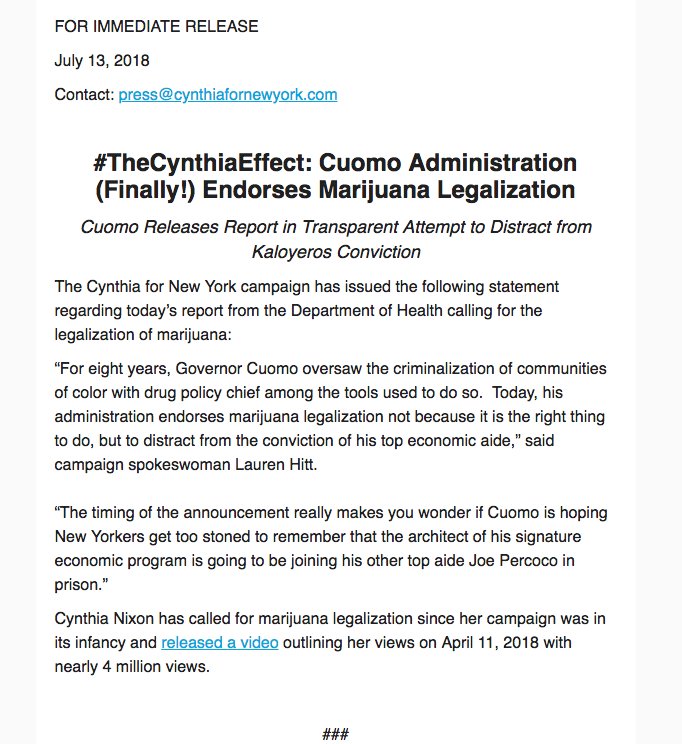 My bet is New Jersey's push to legalize pot is far more influential to Cuomo, combined with a Dept of Health report, than Cynthia Nixon putting up a video on Twitter http://gothamist.com/2018/04/27/nj_marijuana_legalization.php …https://twitter.com/tylerkingkade/status/1017828148585562112 …