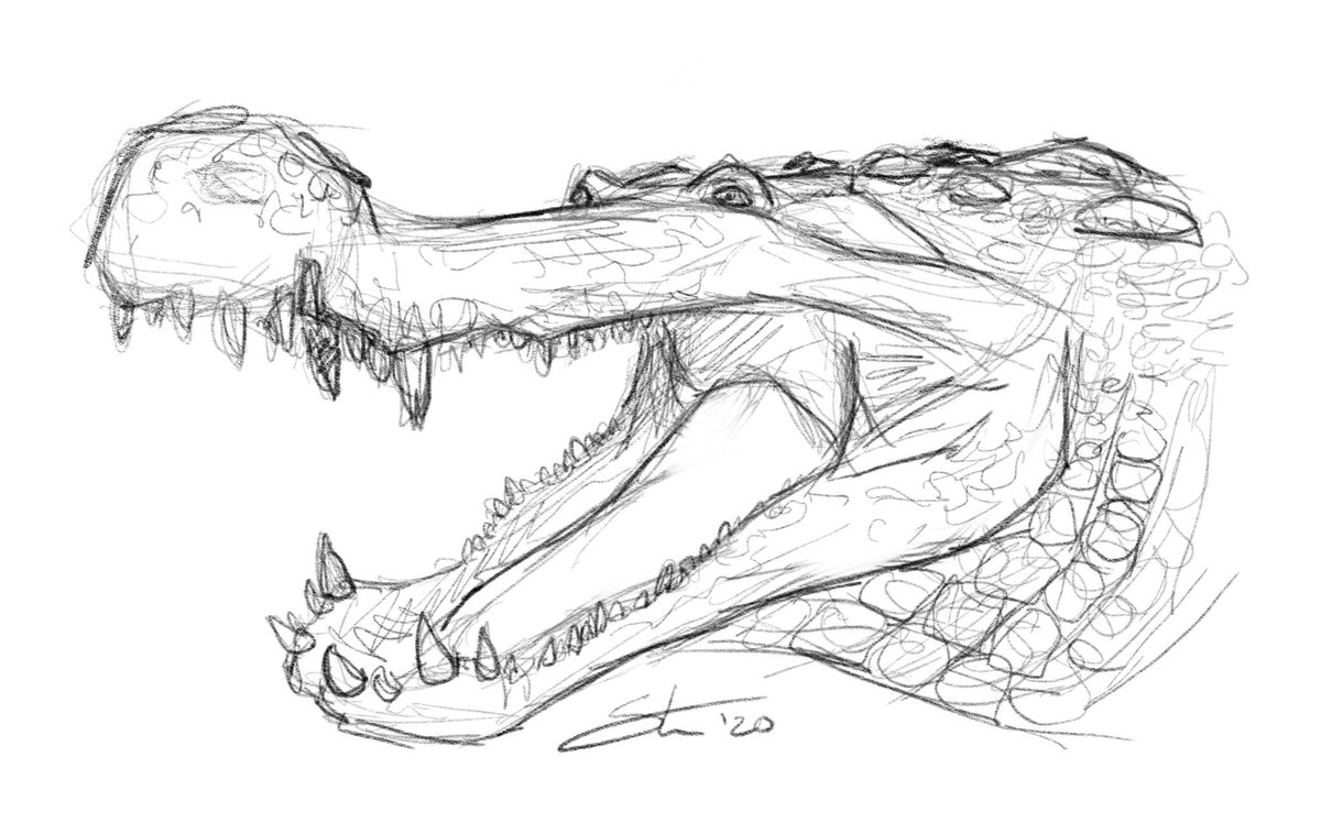 Now to the good stuff. While it’s historically been depicted as a simple scaled-up alligator, Deinosuchus actually has very unique and bizarre anatomy, especially in the skull. First image from Schwimmer (2010), second a WIP of the skull from my illustration.pic.twitter.com/4aK8KeVvAO