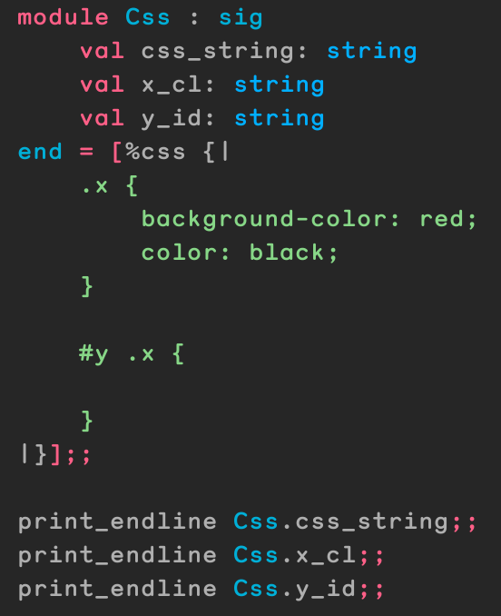 #ocaml PPX for css uniquification! It will find ids and classes in a string literal (or a nearby css file), and replace them with a unique ID. These new constants are then available from the structure definition that it generates!pic.twitter.com/rZSjbBpe9C