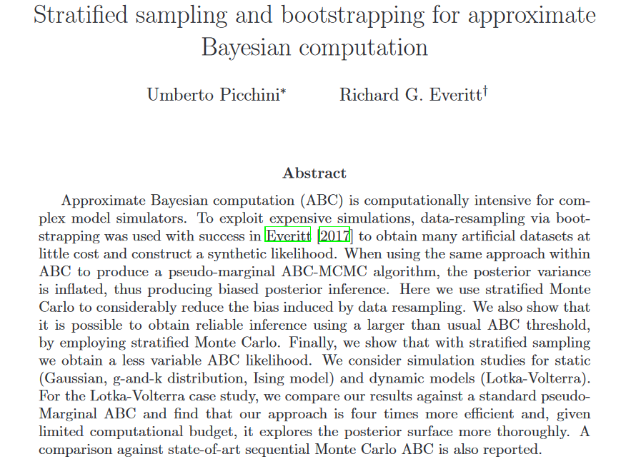 #bayescomp2020 in Gainesville. On Wed 8 Jan I present a work on stratified Monte Carlo and bootstrapping, to alleviate the inefficiency of pseudo-marginal ABC-MCMC with expensive simulators. Joint with@bayesian_stats. Recently upd preprint at https://arxiv.org/abs/1905.07976 pic.twitter.com/woJv28ICxS
