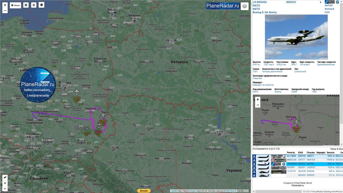 , бортовой номер LX-N90454, позывной #NATO01, производит полёт у границы Белоруссии