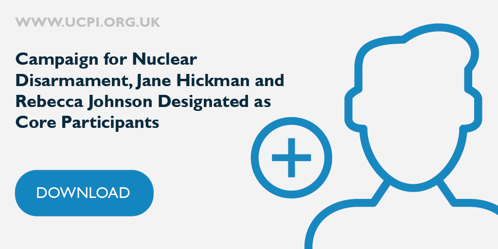 Campaign for Nuclear Disarmament, Jane Hickman and Rebecca Johnson designated as core participants by the Chairman. Download ruling: https://www.ucpi.org.uk/wp-content/uploads/2021/07/20210720-ruling-CP_41.pdf …pic.twitter.com/t9FabD84xd