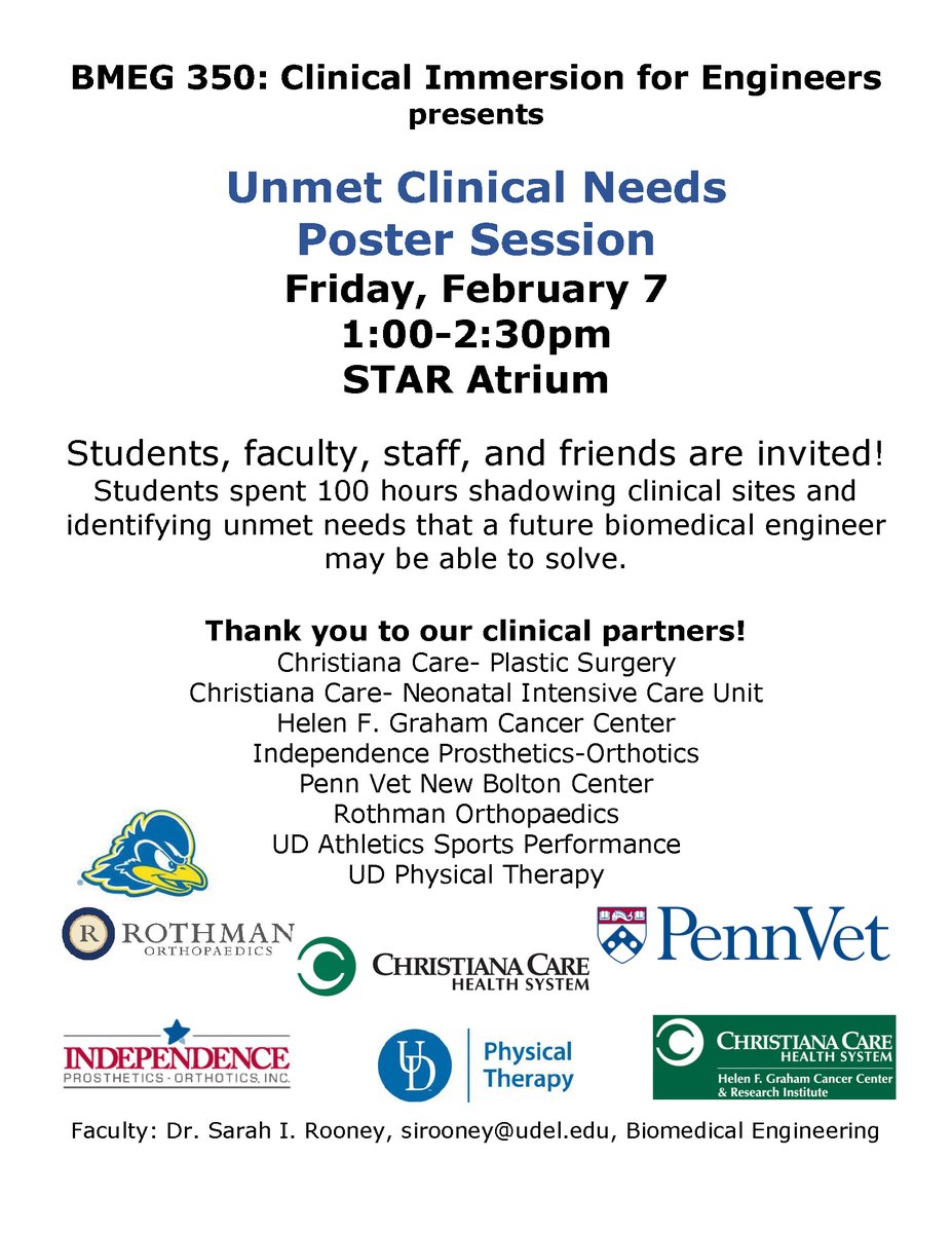 @SarahIRooney's BMEG350 Clinical Immersion is having a poster session highlighting unmet needs with a variety of industry partners. All are invited!#healthcare#Delaware@christianacare@pennvet@UDBlueHens@UDelawarePT@RothmanOrthopic.twitter.com/WWa02DgDdT