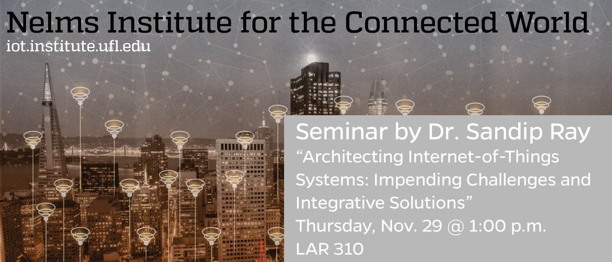 The second Nelms Institute for the Connected World Seminar features Dr. Sandip Ray, Director of Industry Programs for the Institute. He presents “Architecting Internet-of-Things Systems: Impending Challenges and Integrative Solutions” on Thursday, Nov. 29, 1:00 p.m, Larsen 310.pic.twitter.com/Dgwglxew6X