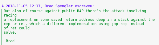 Isn't KERNEXEC was a PaX feature? ;) You know all too well that RAP is useless if code-injection is possible (it completely eliminates its purpose). Guess what? I also clearly mention this if you've missed it (which turned out to be true of course):pic.twitter.com/WmEcjT3VYe