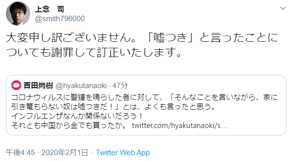 百田氏の時みたいにちゃんと謝って訂正するのでしょうか?(・ω・)https://twitter.com/hidelcondorpasa/status/1223519842218602496?s=21 …