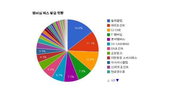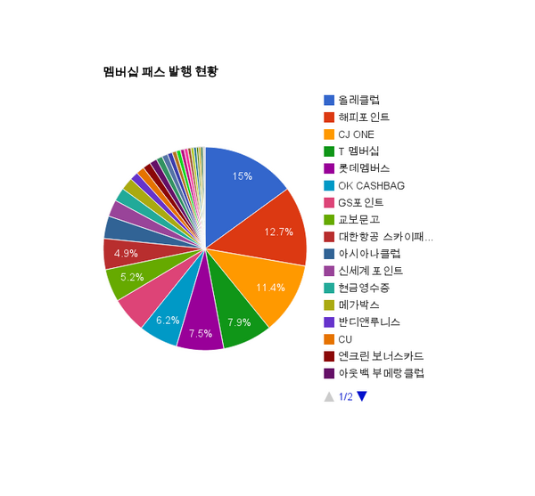 멤버십 패스 만들기 페이지에서 생성된 패스 7114 개를 분석해보니 그림과 같은 결과가.. 해피 포인트는 원래 많은 줄은 알았지만 올레클럽이 더 많을 줄이야.. 상위 일곱개 정도가 반 이상 차지..pic.twitter.com/wMG0zOhE