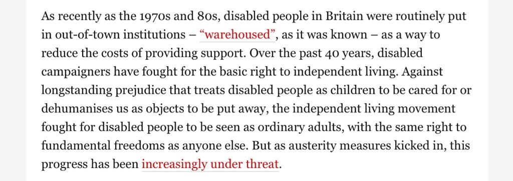 Fantastic to see my story on disabled people forced into care homes shared widely - and especially by non-disabled people who had no idea this happened. Non-disabled anti-cuts campaigners - please join the fight. https://www.theguardian.com/society/2018/mar/27/disabled-people-independent-living-care-homes …pic.twitter.com/23mtyKaQ0t