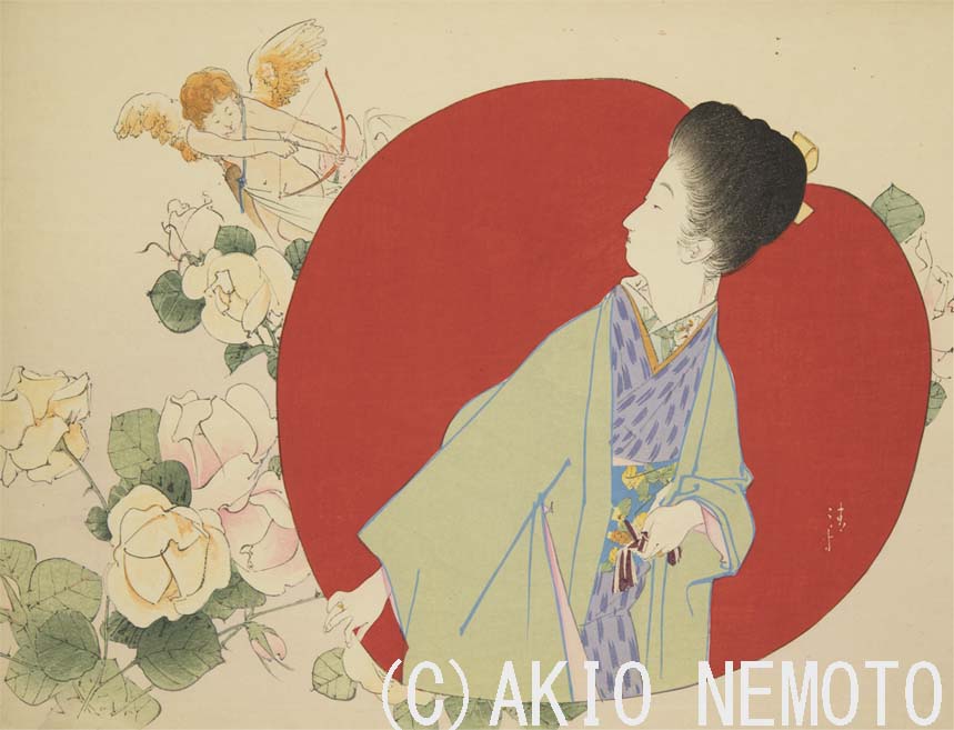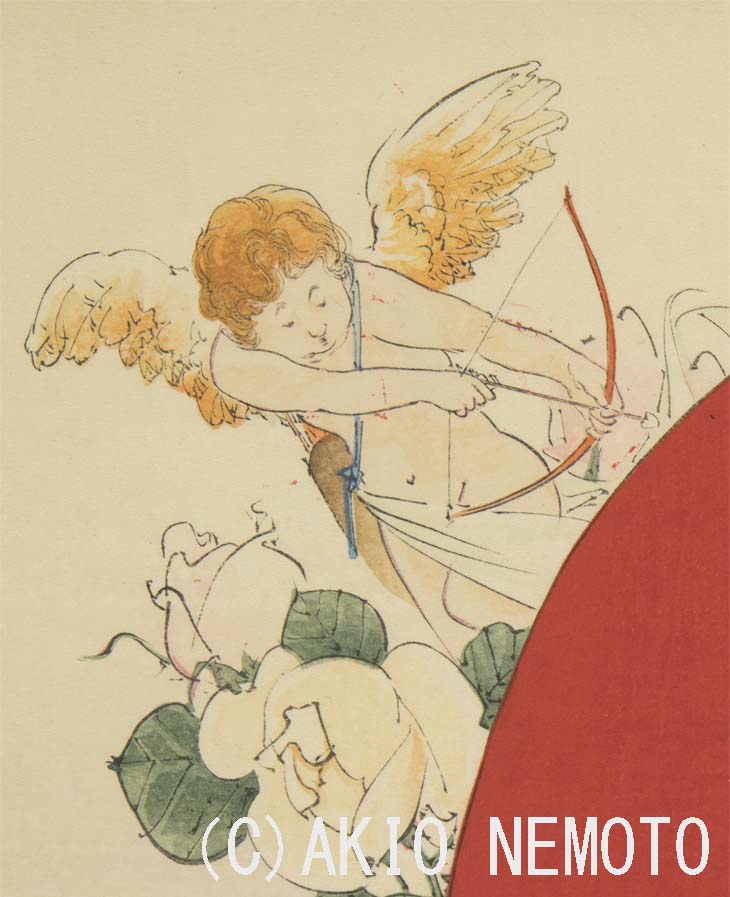 鏑木清方による、恋のキューピッドという珍しい題材。小説『恋女房』の口絵より。小説にはキューピッドは出てきませんが、許嫁の男性と浅草見物をしているうちに、心から結婚を望むようになった雪子の心情を描いているのでしょう。2/15より太田記念美術館で開催の「鏑木清方と鰭崎英朋」展で展示。pic.twitter.com/s4GhB81B5f