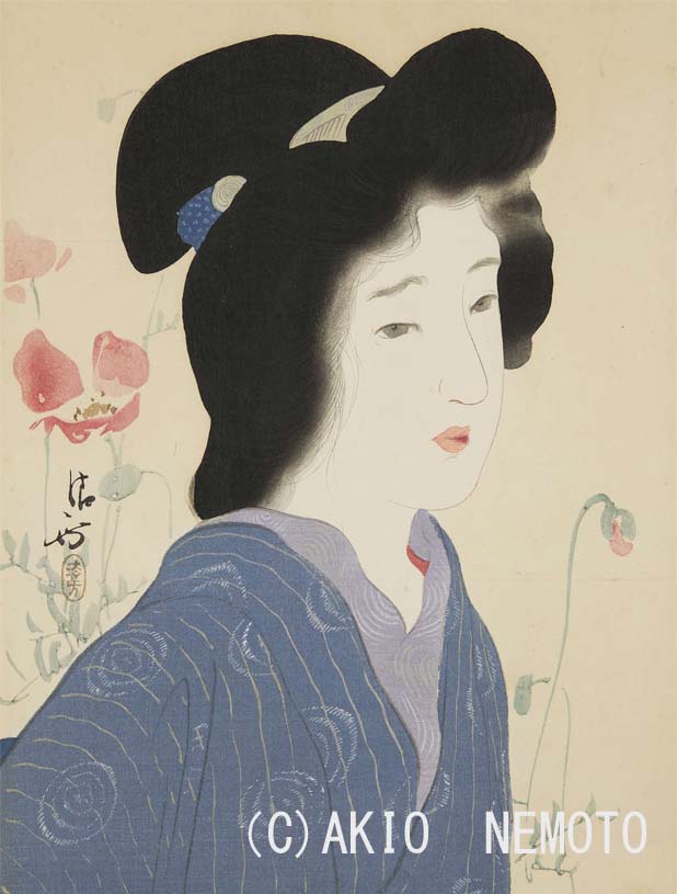 浮世絵版画では、輪郭線を墨色で摺ることが一般的ですが、こちらの鰭崎英朋の木版画では、女性の肌の線を薄いピンク色で摺ることで、肉感を出しています。まつ毛や眉毛、髪の毛を細く彫る彫師の技術にもご注目。原宿の太田記念美術館にて2/15より開催の「鏑木清方と鰭崎英朋」展で展示します。pic.twitter.com/Bjs5S6f5bJ