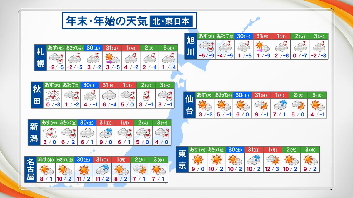 年末年始の全国の天気。天気の崩れは大晦日。今週末は上空の寒気はいったん抜けるのでこの日に降るのは広く雨となる予想。その後、年明けからやや強めの寒気が流入、年明けは寒さが戻ってきます。日本海側は雪が降りやすくなり、北日本では再び荒れた天気などに注意。pic.twitter.com/iNEErkvC0Y