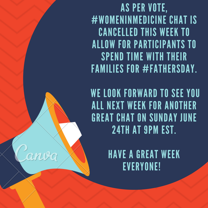 #womeninmedicine chat is cancelled this week to allow for participants to spend time with their families for#FathersDay. We look forward to see you all next week for another great chat on Sunday June 24th at 9pm EST. Have a great week everyone! Enjoy your families!pic.twitter.com/8ewxyUcMYh