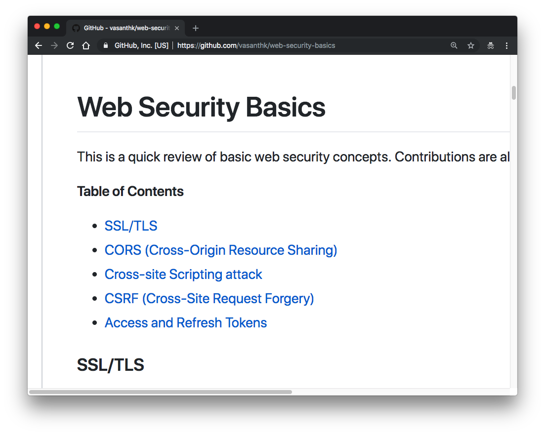 - https://github.com/vasanthk/web-security-basics … - Learn about web security concepts. Understand cross-site scripting (XSS), Cross-site request forgery (CRSF), SSL & more