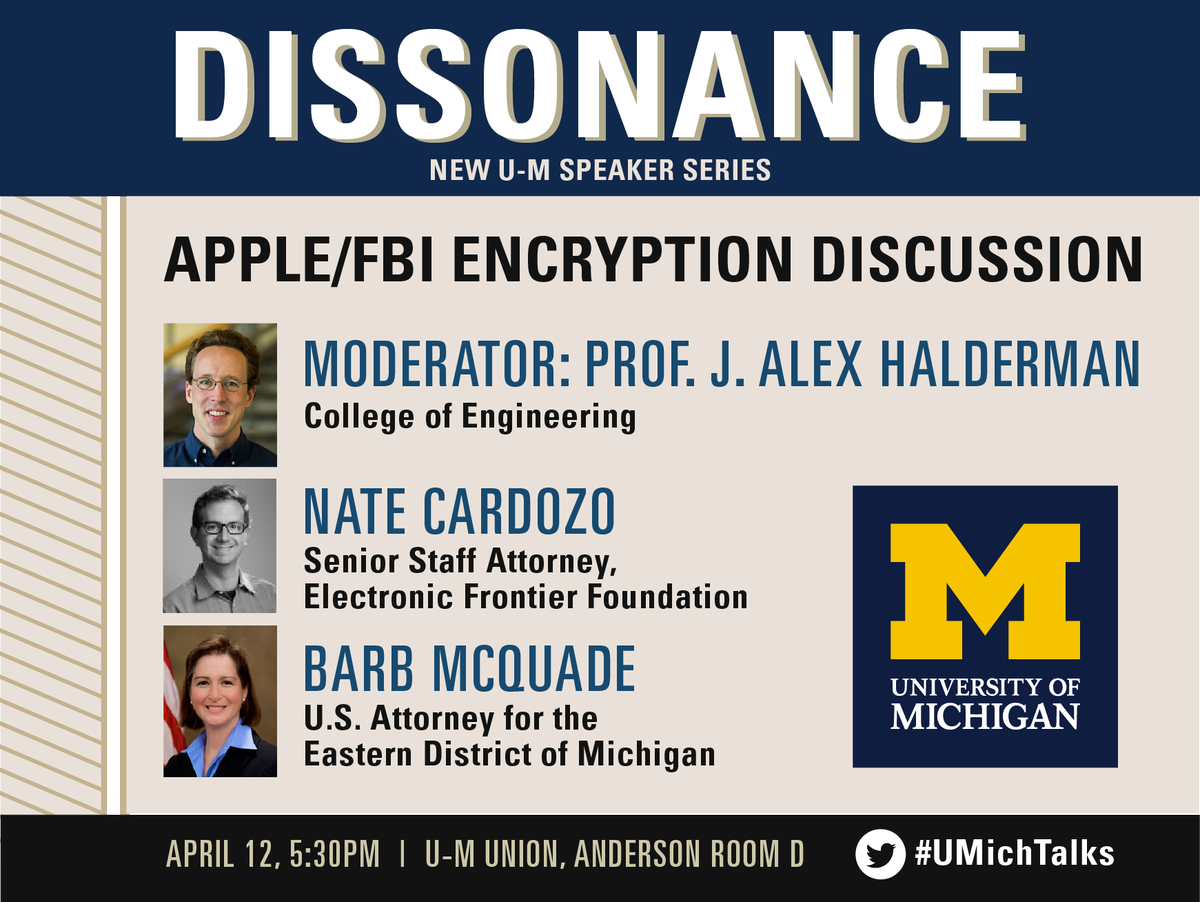#UMichTalks Tues, 4/12 at 5:30: DISSONANCE speaker series:#AppleFBI encryption hosted by@jhalderm &@UMengineeringpic.twitter.com/cLtZZbQiuS