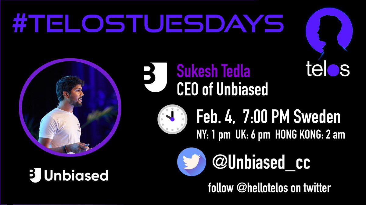 #TelosTuesdays Live on Twitter and get your questions ready for the CEO of Unbiased,@unbiased_cc@sukeshtedla , as he will announce some exciting things!#telos#startups#future#unbiased