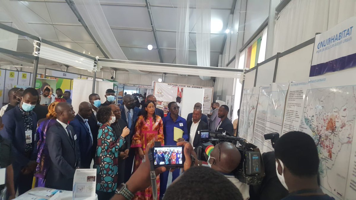 @diallousmane a visité le stand de@UNHABITAT. Là, il a reçu de la part de la Conseillère technique principale du Projet#SANITAVillesDurables les explications sur les cartes du Schéma Directeur d’Urbanisme du Grand Conakry.@GouvGN