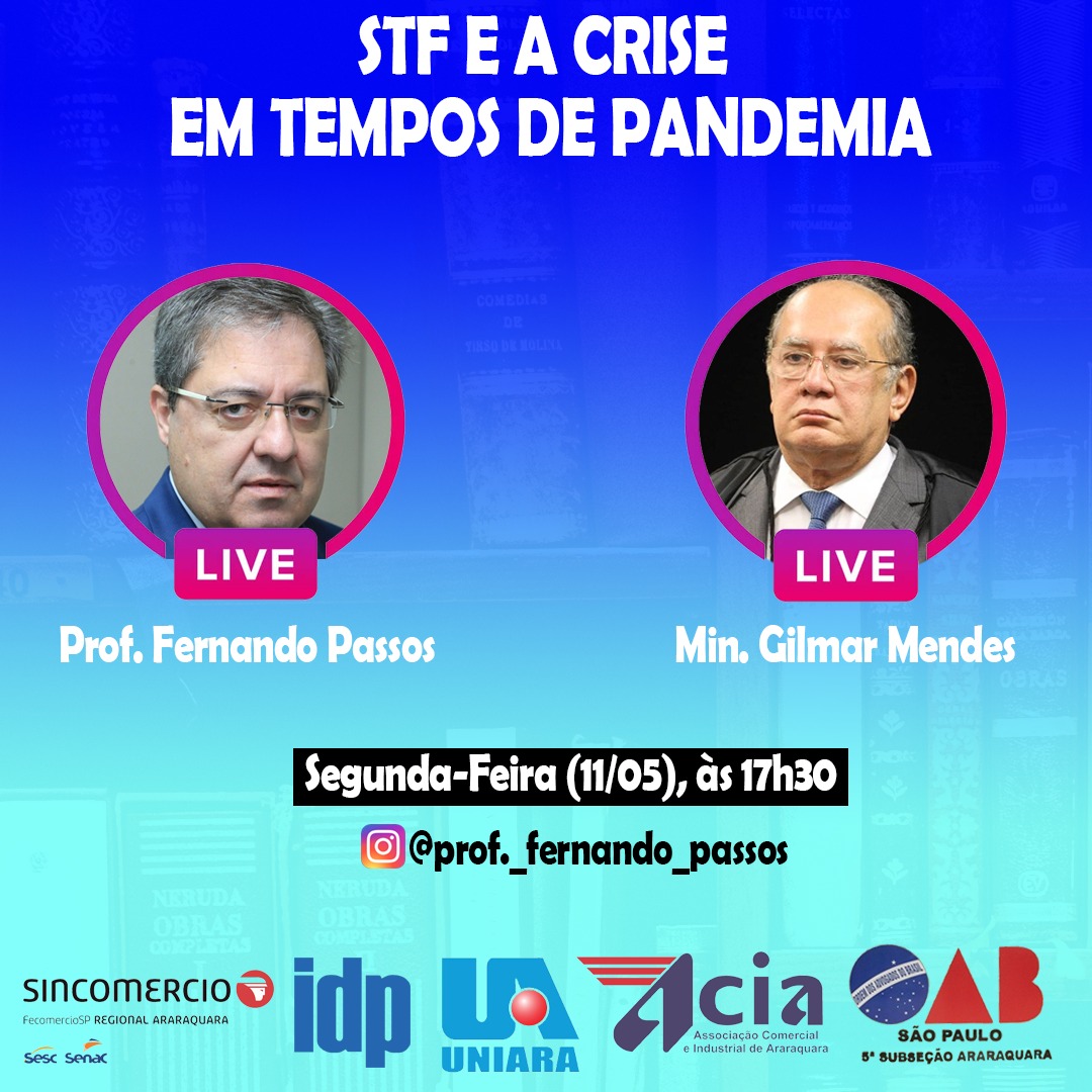 O Prof. Fernando Passos, coordenador do curso de Direito da Uniara, participará da live: STF e a Crise em Tempos de Pandemia, com o Min. Gilmar Mendes, do Supremo Tribunal Federal. A live será hoje, às 17h30, pelo Instagram do Prof. Fernando Passos (