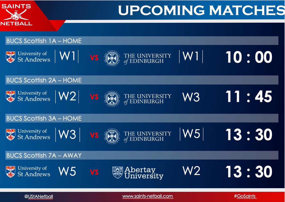 Good luck to all 6 @UStANetball teams who are playing today#evertoexcel#GoSaintspic.twitter.com/azOC6eJpDu – mjesto: University of St Andrews
