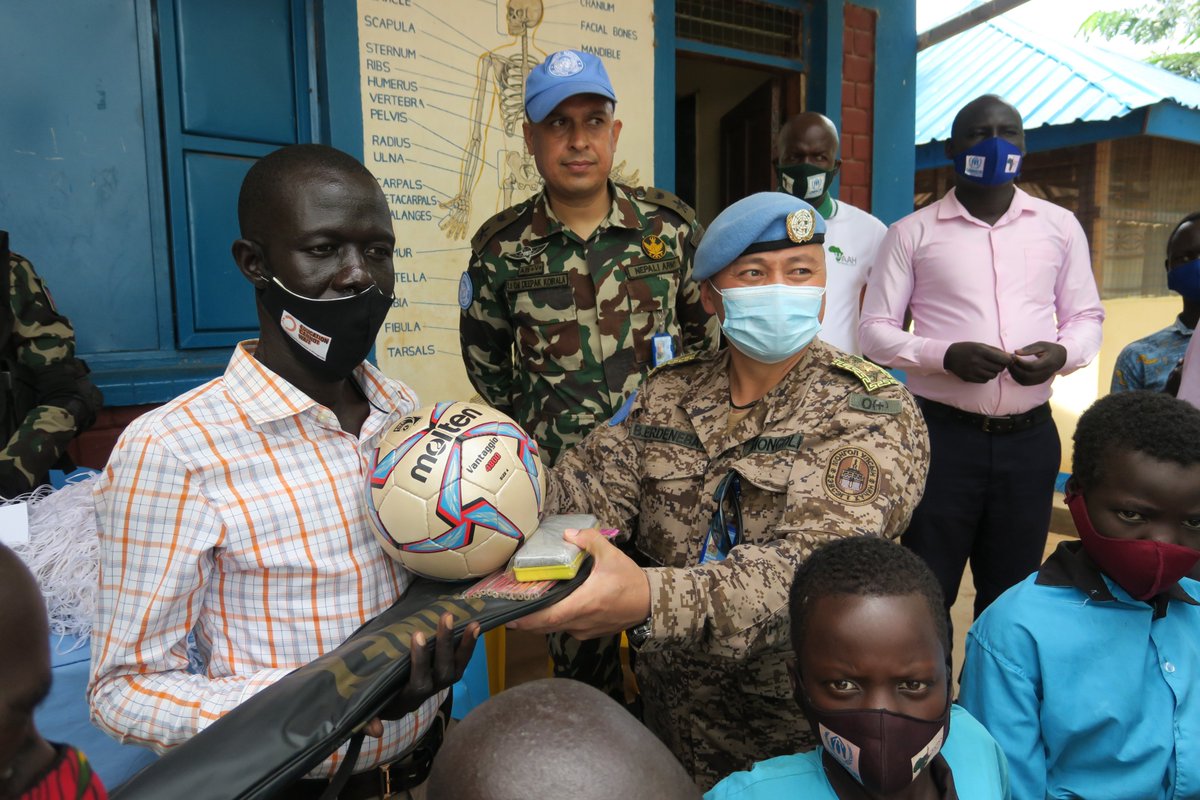 #UNMISS patrol team handed over medicines, stationery & sports items to students of Godo Primary School in Gorom Refugee Camp, located 26 kms from Juba