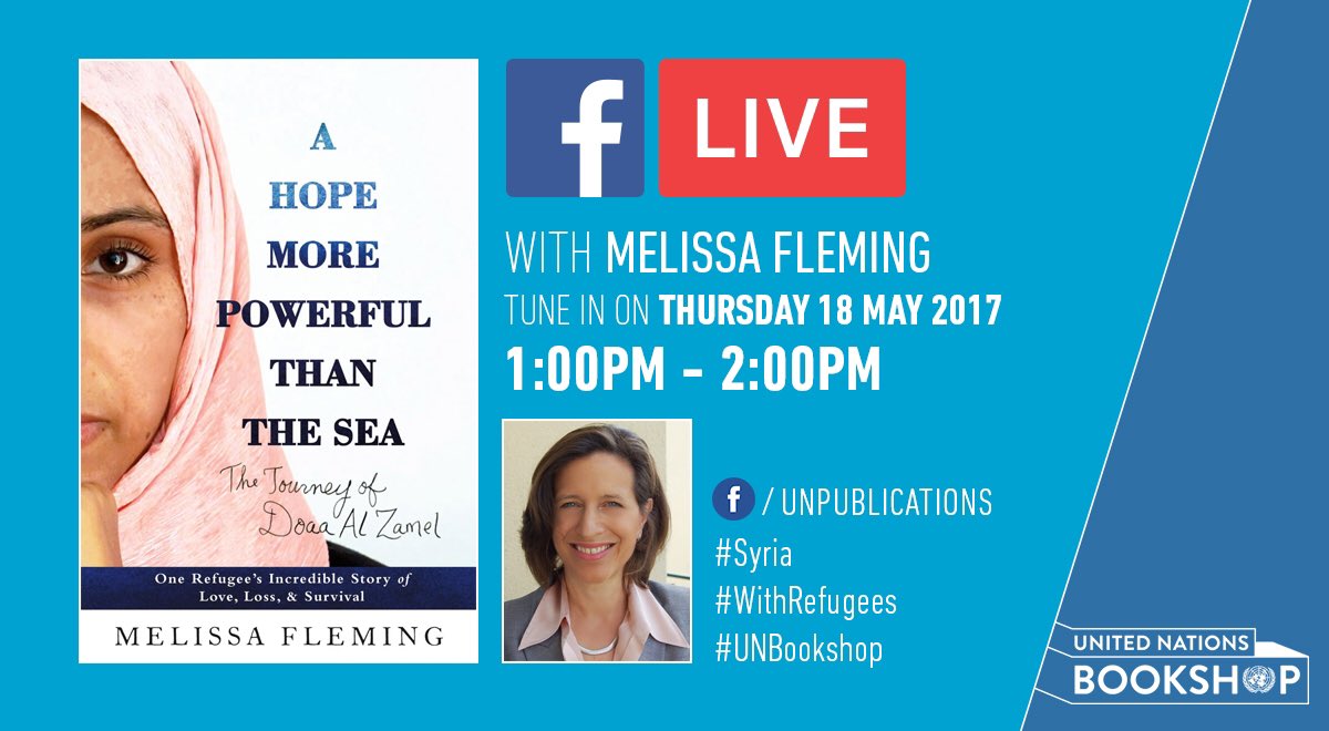 Happening now: Discussion w/ @melissarfleming, author of "A Hope More Powerful Than the Sea". Watch live http://www.facebook.com/unpublications  #UNBookshoppic.twitter.com/6ZJPvk7f3W