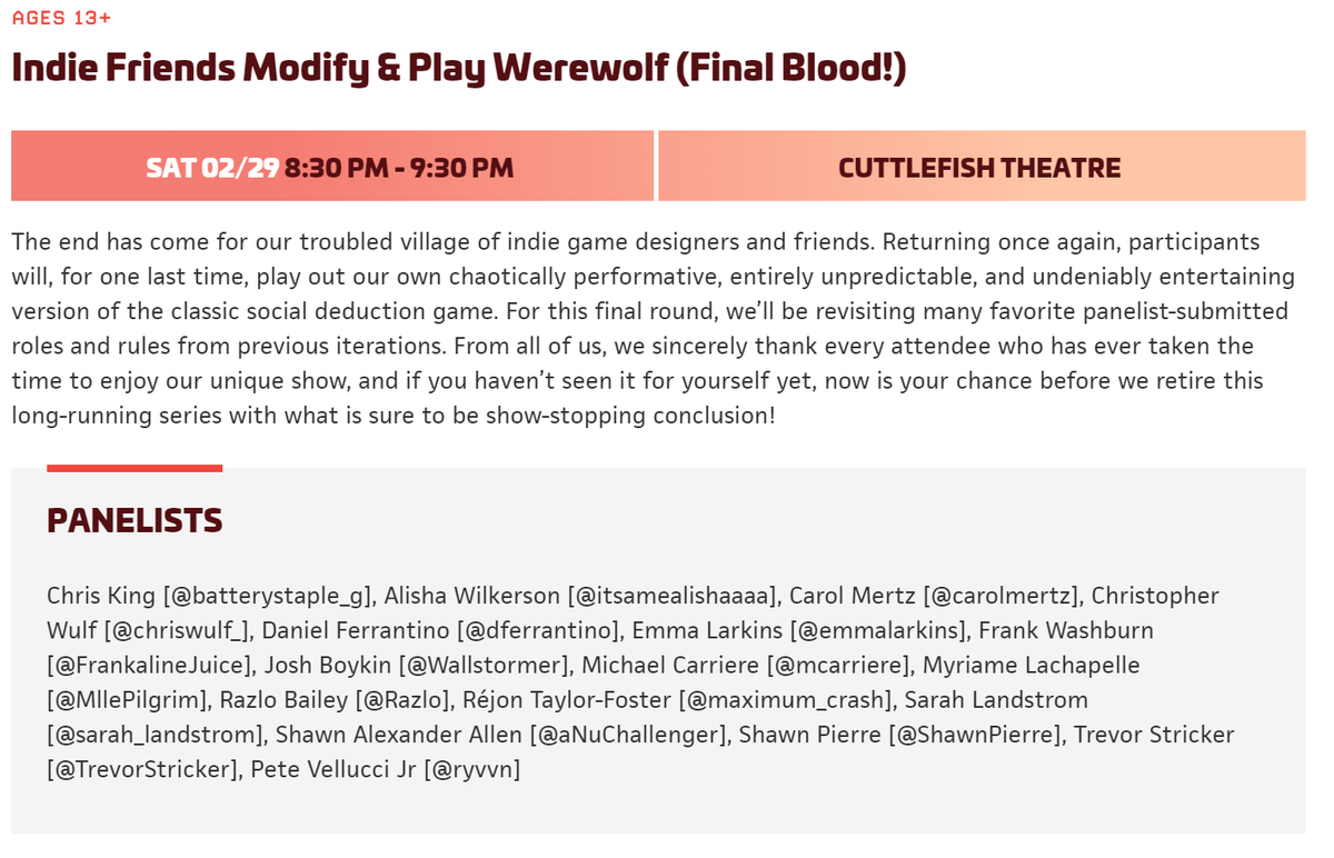Also, we're sending off @ryvvn's fantastic 5-year-running werewolf/mafia PAX panel - we're pulling out all the stops! Sorted by "rules that made us laugh the most." (sat @ 8:30, cuttlefish)pic.twitter.com/17hDSY3gX9