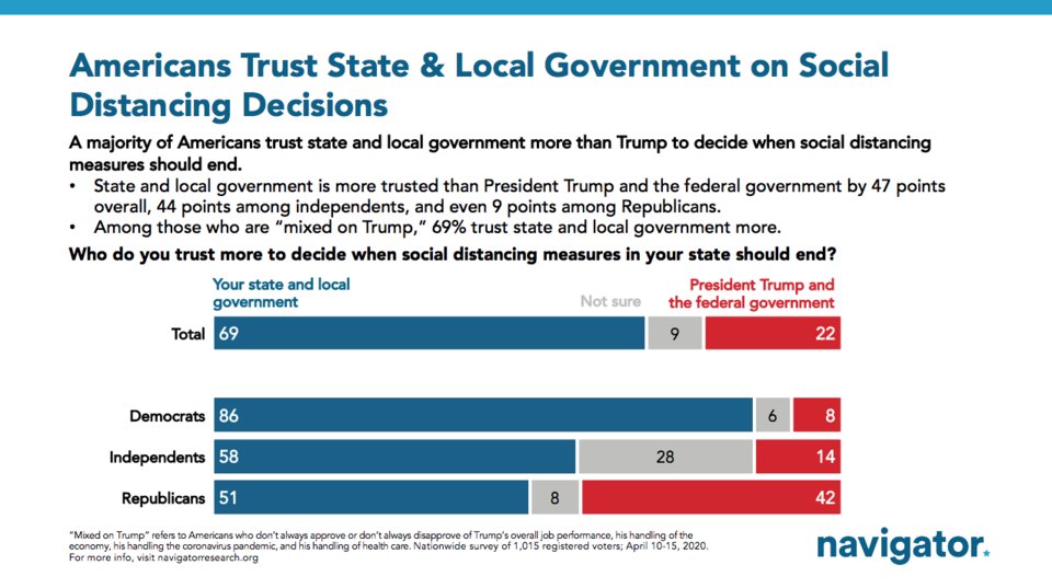 Most Americans trust their local and state governments to make decisions about social distancing. According to the latest poll from Navigator, 69% trust them more to make the ultimate decision on when social distancing should end. https://navigatorresearch.org/public-opinion-on-coronavirus-navigator-daily-16/ …pic.twitter.com/sdiY4vfpuc