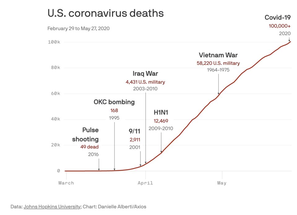 "More than 100,000 Americans have died of the coronavirus, according to data from Johns Hopkins — a terrible milestone that puts the death toll far beyond some of the most tragic events in U.S. history." https://bit.ly/3dfpV16 pic.twitter.com/iDwI3hbRzY