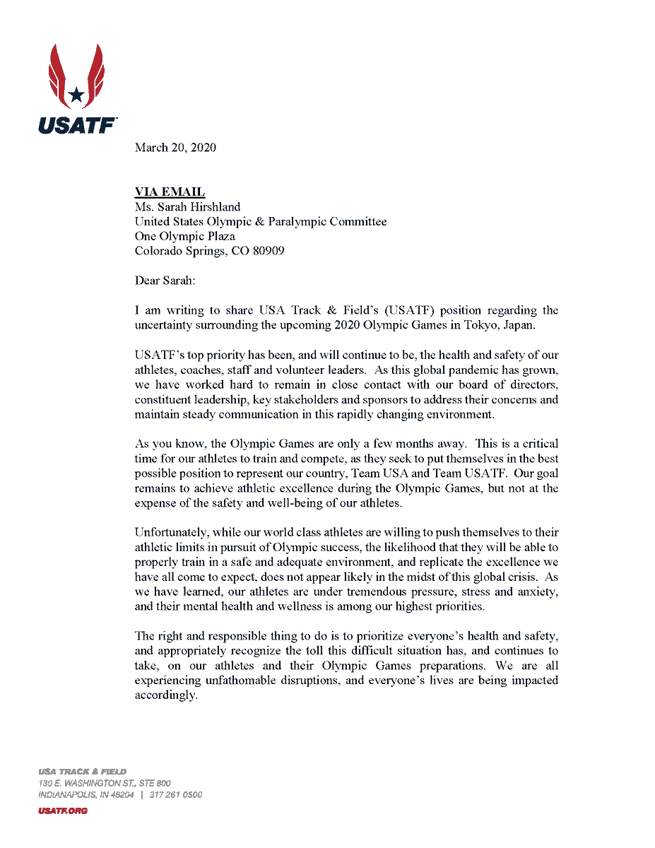 I am glad USATF spoke up. IOC encouraged all athletes to continue to prepare for the Olympic Games Telling athletes to carry on as normal amidst this public health crisis is irresponsible and demeaning.