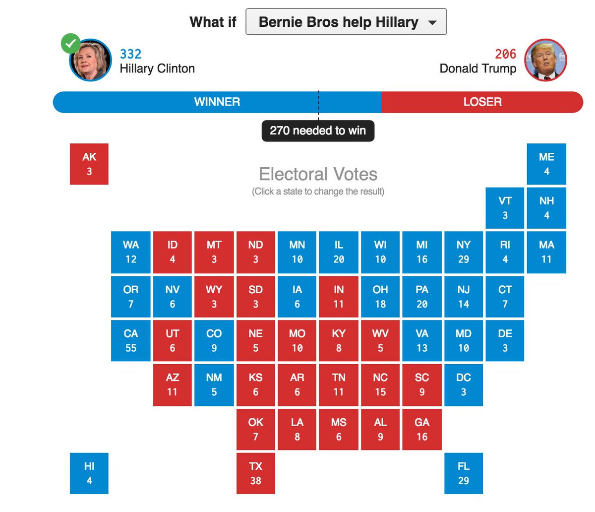 What if Bernie Bros help Hillary get to 270? See that scenario & more in our interactive: http://usat.ly/1VMPLNG pic.twitter.com/URkq75Wsgb